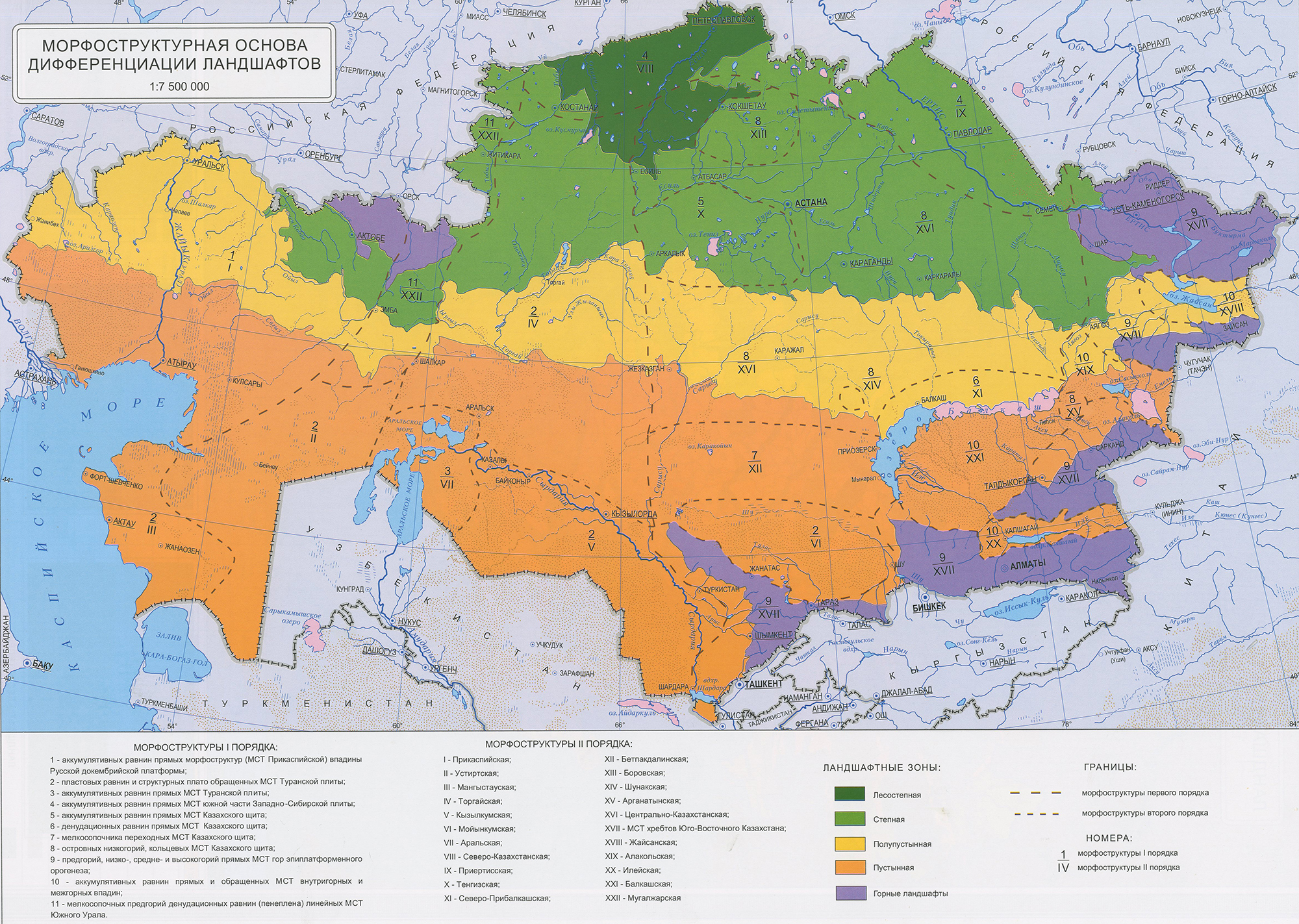 Map of morphostructural basis of differentiation of landscapes of the Republic of Kazakhstan